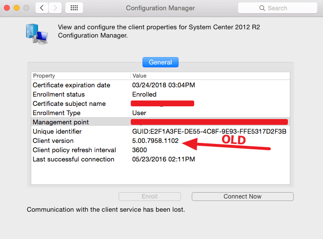 Recently some of our scam mac client has been prompted to input username/password to enroll, but even after the successful sccm enrollment, when I check the SCCM agent in system preference on user’s mac, it said ” Communication with the client service has been lost”.