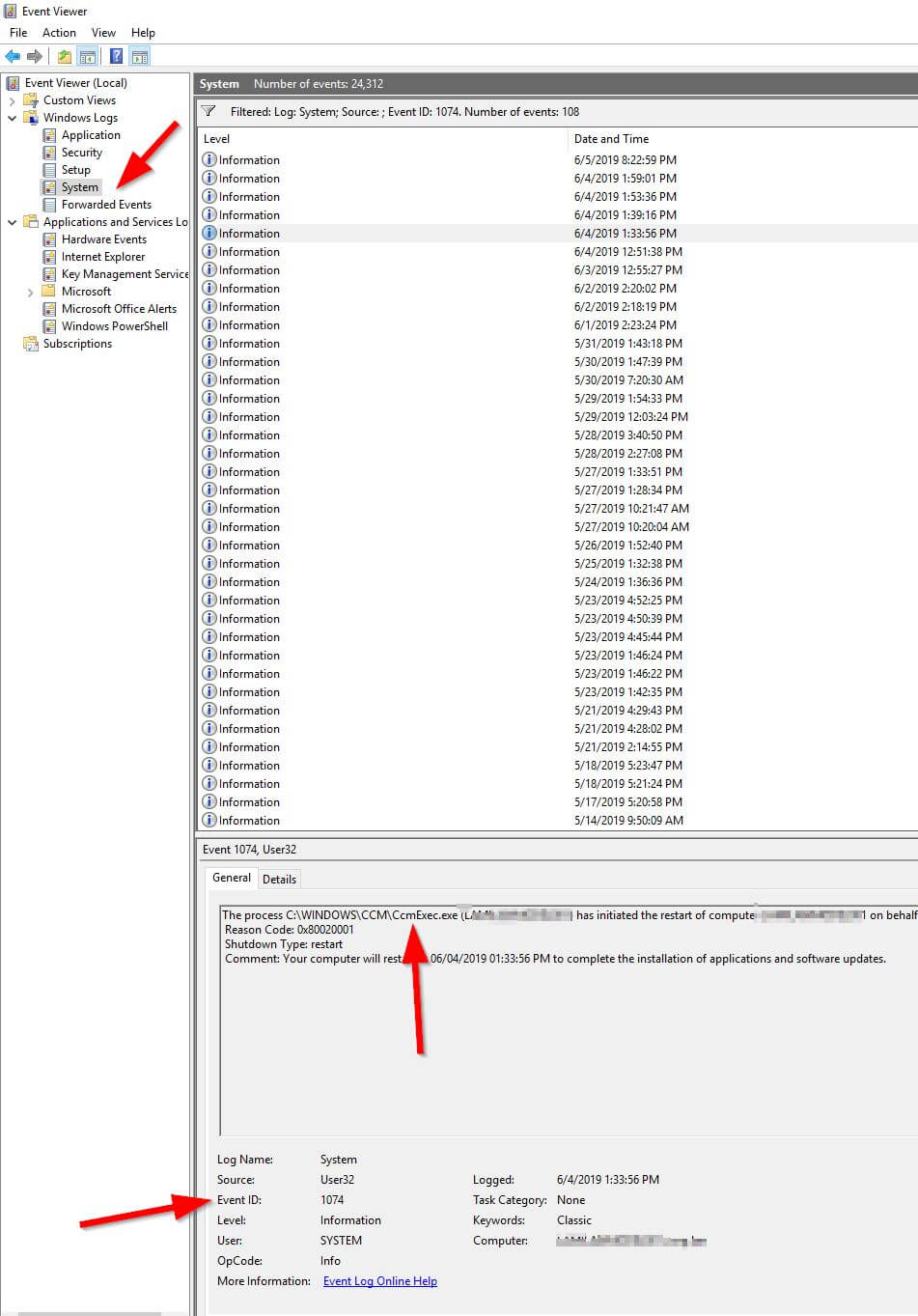 How to Find Out If SCCM Rebooted Your Machine? June 6, 2019 by meOpen event viewer, “Windows Logs” – “System”, and filter your logs with event ID 1074.