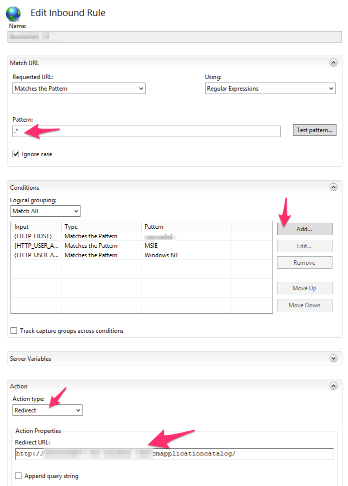 - {HTTP_HOST}, matches the pattern selfservice; {HTTP_USER_AGENT}, matches Windows NT and MSIE;Redirect to http://sccm/applicationcatalog