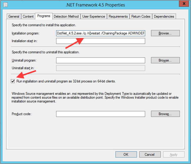 In the settings, we need to set Run installation and uninstall program as 32-bit process on 64-bit clients.