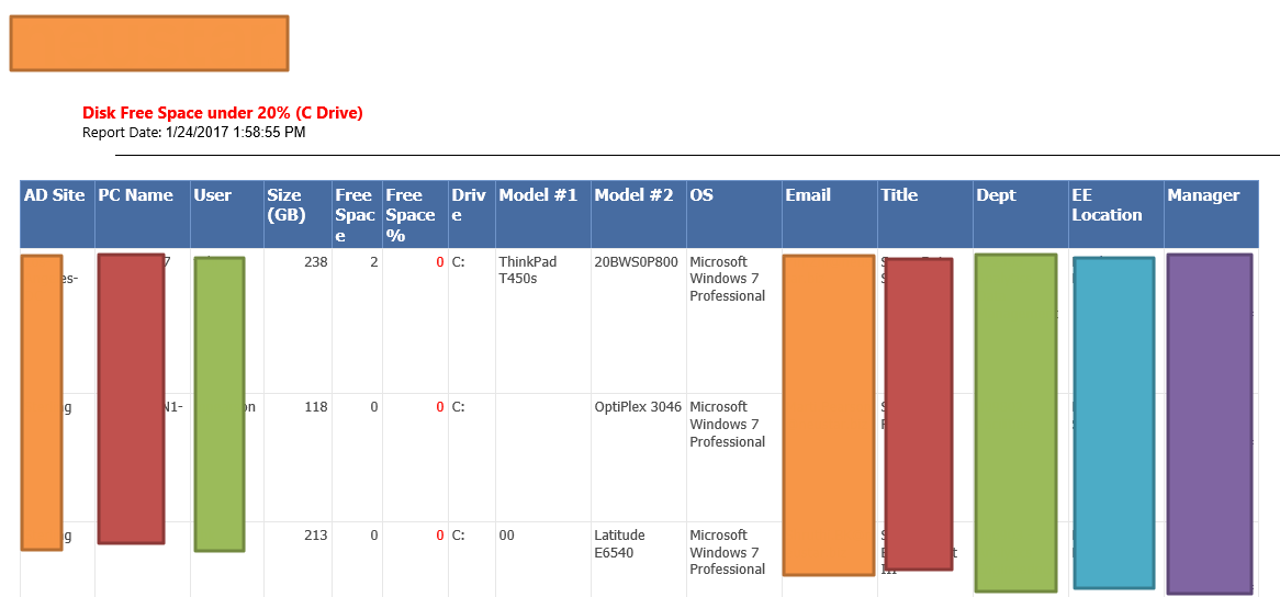Here is the SQL statement for my SCCM Report on disk free space under 20%, it will display the user machine AD Site, PC Name, Last Logon User, Total Disk Space, Free Space, Free Space Percent( All in GB), Drive Name, Model Name ( Lenovo models will be on Model #1, the rest will be on Model #2), OS, User Work Email, Title, Department, Employee Location, and Employee Manger information.